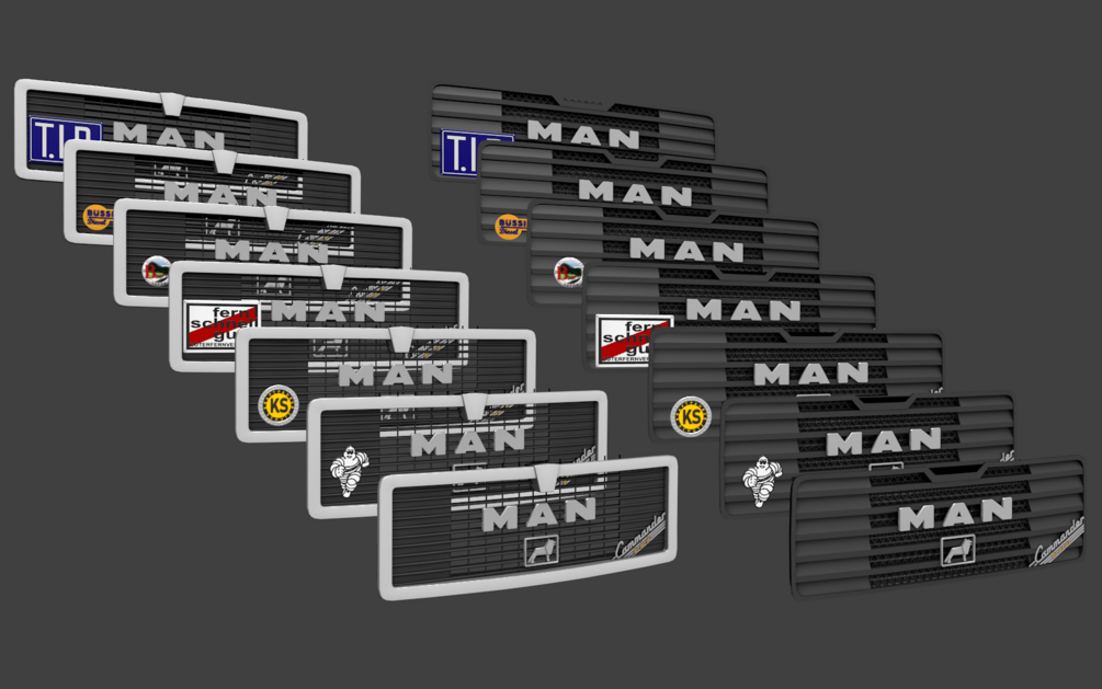 Description: This modification adds 14 own build MAN F2000 Commander grills with or without extra badges. Both versions (old styled grill) & (new styled grill) are available in plastic only, as this is the true style for the rare Commander badge. Both versions share the same extra badges. Each badge is modeled.