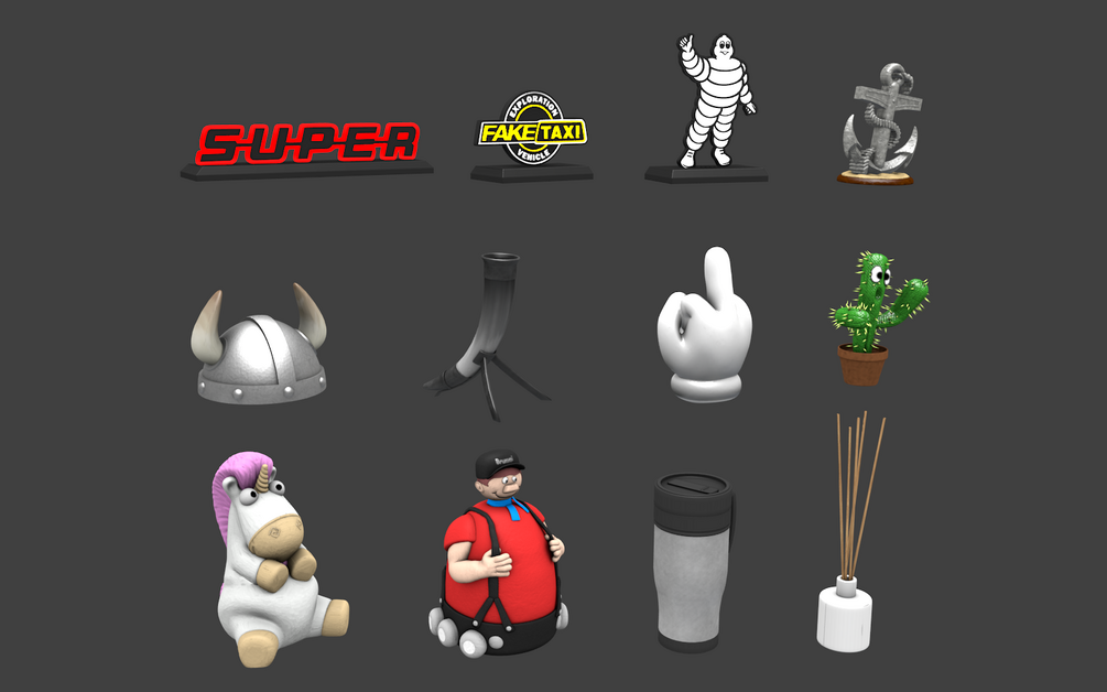 Content: LED Super Logo in different colors, LED Fake Taxi, LED Michelin Man, Brummi Plush, Unicorn Plush, Cactus Buddy with physics, Bull Horn, Middle Finger, Viking Helmet, Anchor, Vape Sticks, Thermo Mug, Sunglasses, Air Diffusers